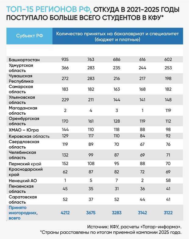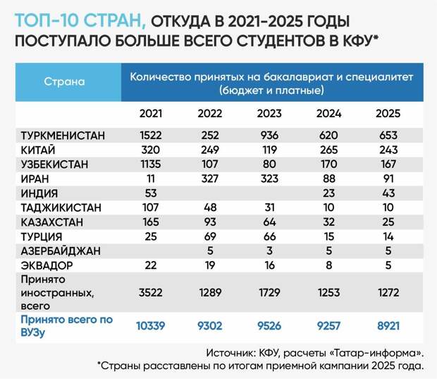 Общий приток студентов с 2021 года в КФУ сократился – всего на бакалавриат и специалитет в 2025-м было принято чуть более 8,9 тыс. человек. Тогда как в 2021-м – более 10,3 тыс., а в 2024-м – свыше 9,2 тыс. При этом количество поступивших в КФУ иностранцев даже чуть выросло – до 1272 человек вместо 1253 годом ранее (такой вывод можно сделать из тех разрозненных данных, что в вузе предоставили «Татар-информу»; общей цифры нам не назвали).