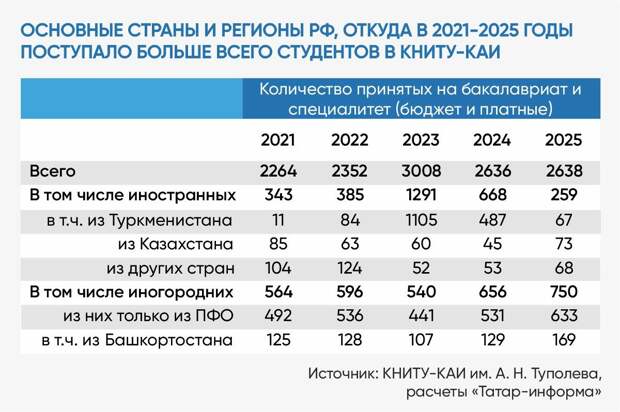 Что касается иногородних студентов, то в основном и в авиационный вуз, и в КНИТУ поступает молодежь из регионов ПФО. И немножко – с Урала. В случае с КАИ лидируют по абсолютным цифрам Башкортостан, Чувашия и Удмуртия. Если в 2021 году из соседних по округу регионов зачислили 492 человека, то в 2025-м – уже 633. Из других регионов поток вырос менее существенно – с 72 до 117 человек (пик пришелся на 2024 год).