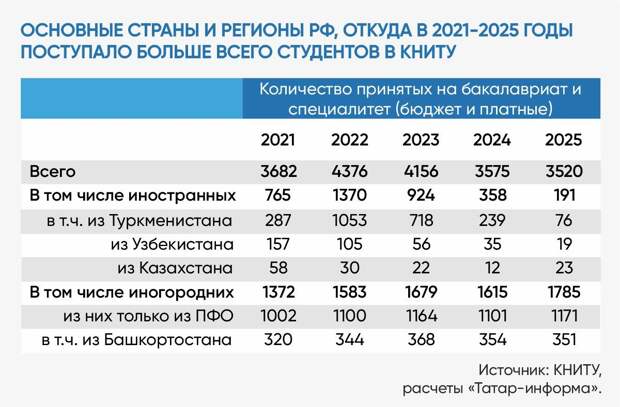 А вот в КНИТУ за пятилетку, при некотором снижении числа поступивших из родной республики и росте приема из регионов ПФО (с 1 тыс. в 2021 году до почти 1,2 тыс. в 2025-м), приток из других субъектов РФ вырос более заметно (с 370 до 614 человек в те же годы). Но все же реального разворота тренда пока не происходит.