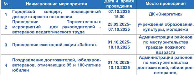 1 октября началась традиционная акция «Забота», в рамках которой представители администраций поздравляют пожилых жителей города и долгожителей. В эти же дни стартовало чествование юбиляров – ветеранов, отметивших 95- и 100-летие.6 октября пройдет турнир по шашкам и шахматам среди ветеранов и пенсионеров, а 7 октября – городской концерт в ДК «Энергетик», посвященный декаде старшего поколения. В этот же день состоится поздравление пожилых граждан в пансионате для ветеранов труда.
