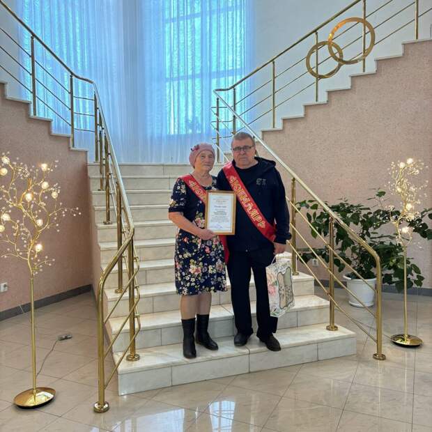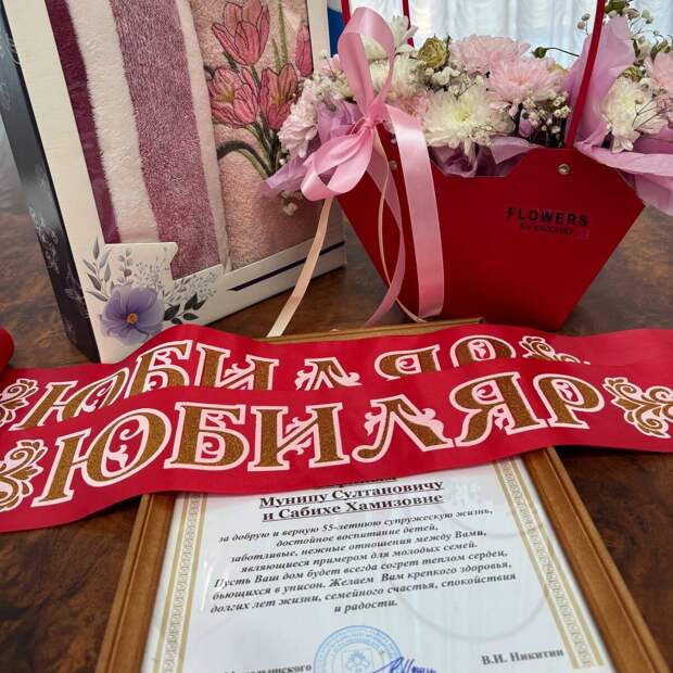 Ляйсан Дульмиева вручила памятный подарок и благодарственное письмо от имени главы района Вадима Никитина. В ответ юбиляры пожелали молодому супругу «вернуться живым и с Победой», а новобрачные выразили надежду пережить такие же юбилеи.
