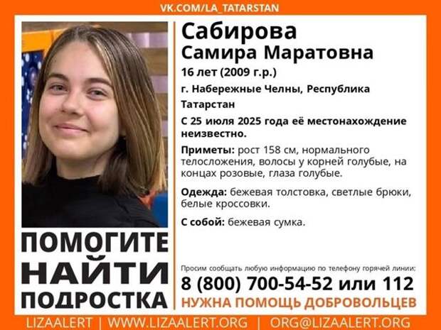 В Набережных Челнах пропала 16-летняя Самира Сабирова. С 25 июля ее местонахождение неизвестно, сообщает поисковый отряд «ЛизаАлерт».