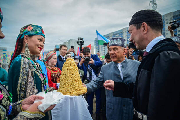 Официальное празднование началось с прибытия на майдан Раиса Татарстана Рустама Минниханова и главы Республики Саха Айсена Николаева. При входе на площадку их приветствовали по традициям сразу трех народов: русским караваем, татарским чак-чаком и якутским кумысом.