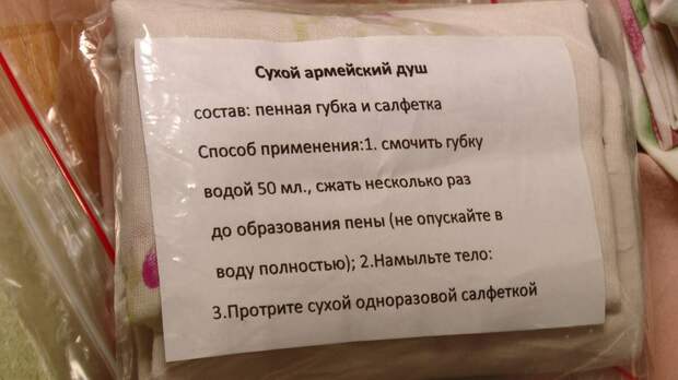«Солдат туда наливает немного водички, оно пенится хорошо и вытирает руки, лицо, потом все тряпочкой. Оно не требует смывания. Наша с вами задача – три ингредиента сложить в один пакетик».