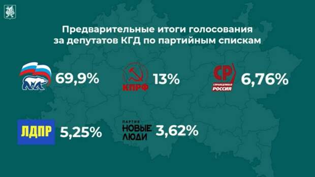 Согласно предварительным итогам голосования в Казанскую городскую Думу, которые озвучили на деловом понедельнике, по партийным спискам лидирует «Единая Россия» с результатом 69,9%. На втором месте – КПРФ (13%), далее идут «Справедливая Россия» (6,76%), ЛДПР (5,25%) и «Новые люди» (3,62%).