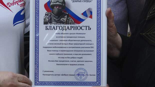«От группы волонтеров “Добрые сердца” вручаем вам благодарность. Вы настоящие труженики тыла. Победа будет за нами! Ура, служим Отечеству», – сказала она.