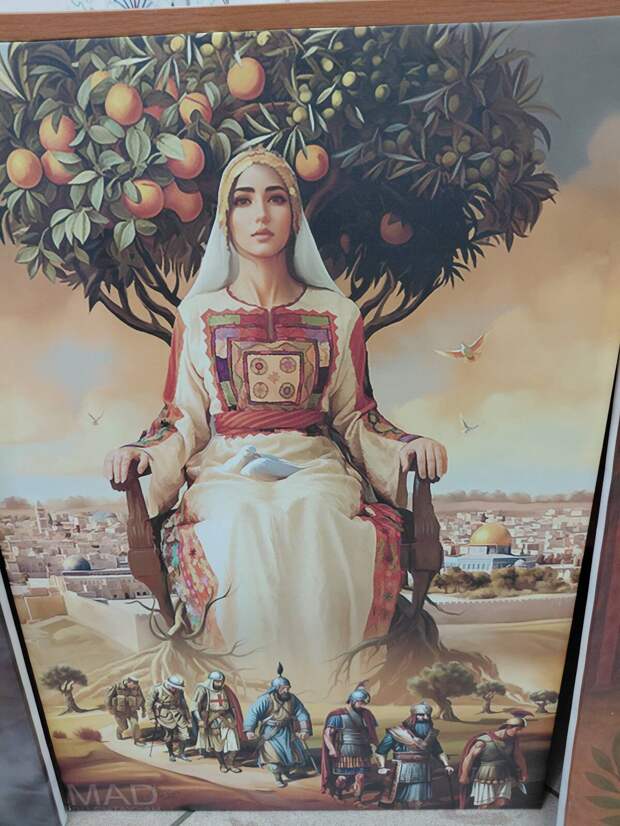 Следующая картина «Палестина – госпожа Земли», ее автор Имад Абу Штайя рассказывает о том, что на протяжении многих веков Палестину оккупировали армии разных империй, уничтожали часть палестинцев, но потом все равно они были вынуждены убегать. Эта картина о том, что справедливость всегда победит.