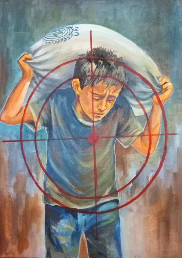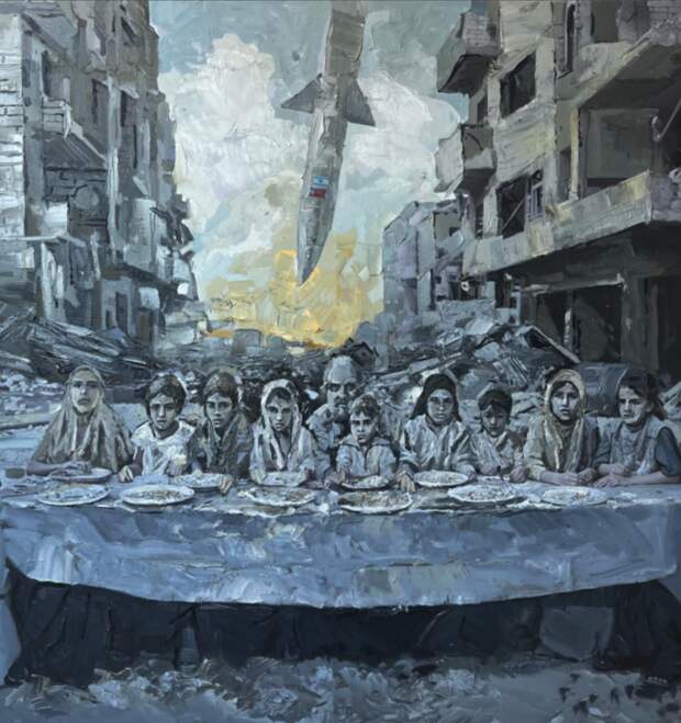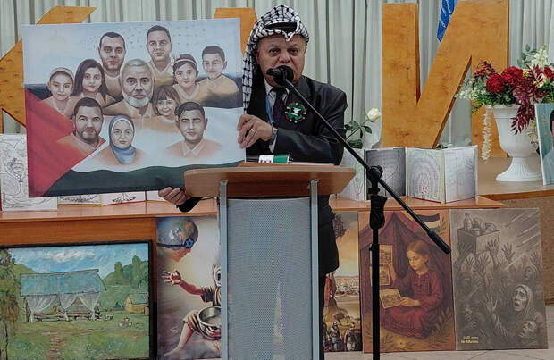 «Сегодня на глазах всех жителей Земного шара происходит невероятная трагедия. Палестинский народ, наших детей убивают не только бомбами и ракетами, но и голодом. Палестинцы сегодня без еды, света, воды, лекарств, больниц – все уничтожено! – подчеркнул гость форума. – Вы видите на картине мальчика, и якобы палестинцам раздают помощь, а на самом деле, собрав под этим предлогом, их расстреливают. Это происходит ежедневно, и пока мы с вами здесь проводим форум, они продолжают расстреливать палестинский народ».