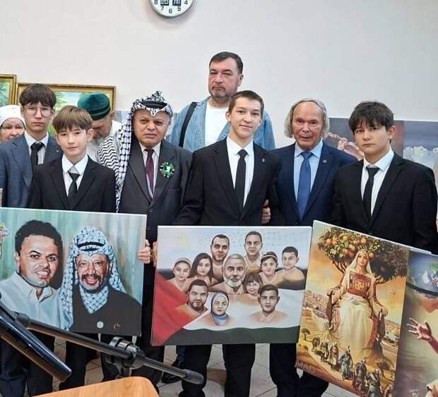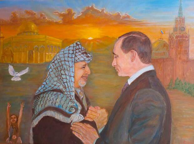 Затем была представлена картина чистопольской художницы Гульсум Хазиевой «Палестино-российская дружба», на которой изображены Владимир Путин и Ясир Арафат. На заднем фоне – московский Кремль и мечеть Аль-Акса, расположенная в Старом городе Иерусалима.