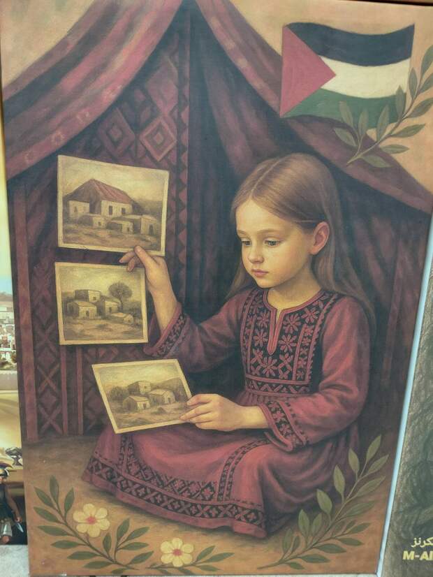 «Вот эта работа нашей художницы Хиба Шнана из города Аль-Халил на Западном берегу реке Иордан. Очень интересная! Знаете почему? – заинтриговал доктор Аль-Балауи. – Девочка, изображенная здесь, живет в Новочебоксарске. Она родилась с очень редкой болезнью. Таких случаев в мире только два: один в Москве и один в Новочебоксарске. Эта девочка живет с момента рождения на аппарате искусственного дыхания. И она не растет. Ей сегодня 13 лет. Она очень слабая. С помощью своего педагога она изучала Палестину, написала картины и участвовала в выставках. И вот наш художник об этом узнала и написала картину, где она как будто выздоровела».