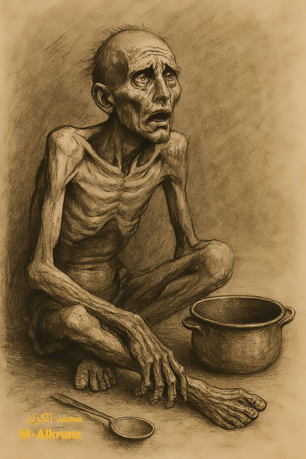 Следующая показанная картина нарисована художником из Газы Мохаммедом Аль-Куронзом. Когда-то он весил 90 килограммов, сейчас – 45.
