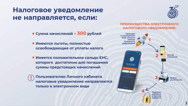 Глава Управления налоговой службы по Татарстану обратил внимание на ряд случаев, когда уведомление не направляется: сумма исчислений меньше 300 рублей, имеются льготы, освобождающие от уплаты налога, либо же у налогоплательщика имеется положительное сальдо единого налогового счета, которого хватает для погашения начисленной суммы.