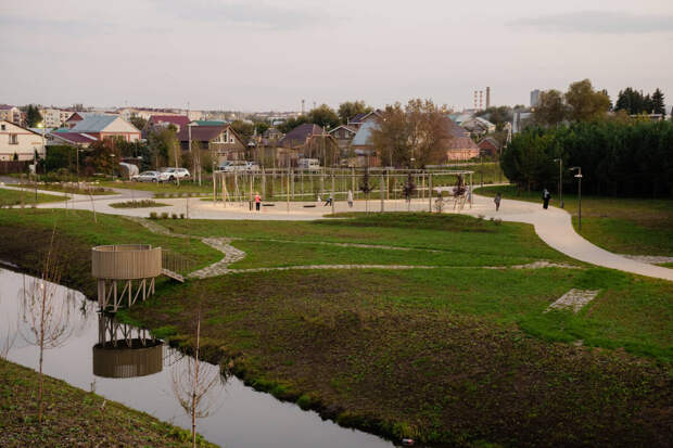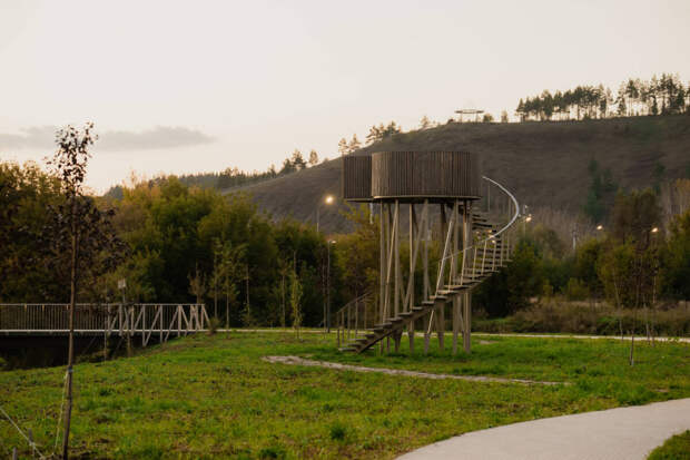 Отдельным акцентом стал Эко-парк – продолжение Каскада прудов и благоустроенный участок вдоль измененного русла реки Бигаш. Здесь появились смотровые вышки для наблюдения за птицами, мосты, качели, гриль-зона с навесом и столиками.