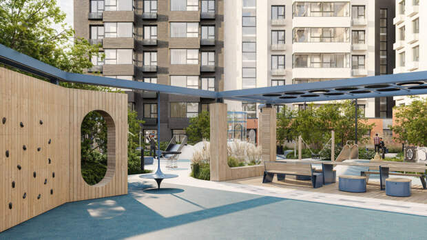 Линия берет свое начало от многофункциональной зоны, где будет размещен амфитеатр и стенка для скалолазания. Рядом разместят просторную беседку с навесом, которая станет центром общения и встреч для будущих жильцов.
