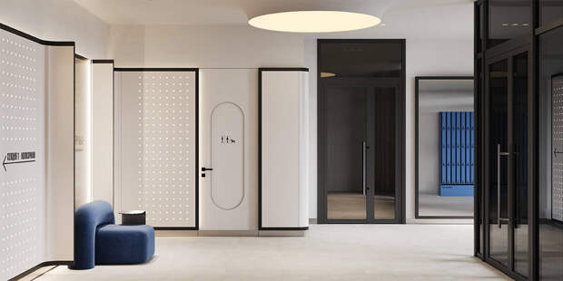 Дизайн пространств компания, как всегда, выдерживает в своем авторском монохромном стиле. Архитектор проекта отмечает: «Цветовые акценты мы выбрали в соответствии с тематикой — это синие декоративные почтовые ящики и пуфы». Стоит упомянуть, что пуфы имеют форму самолетной турбины.