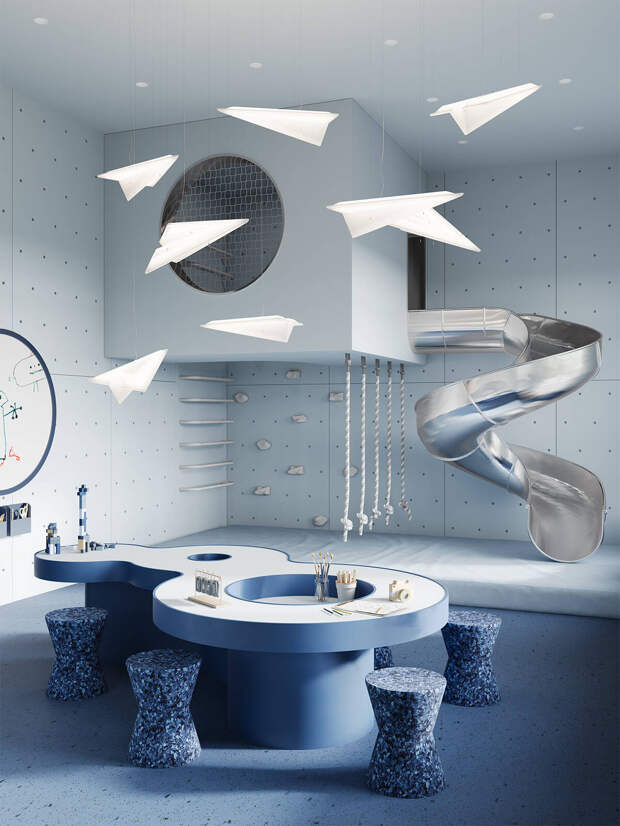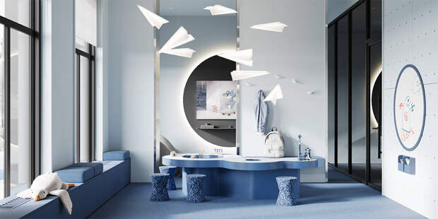 Еще одним интересным элементом является просторная детская комната, где предусмотрены различные зоны для игр, отдыха, творчества и просмотра мультфильмов для детей разного возраста. Прозрачная перегородка позволит родителям следить за малышами, не находясь с ними в одном помещении.