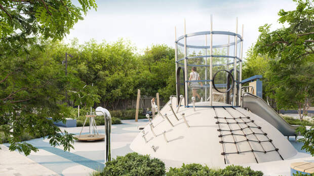 Затем траектория переходит в игровую зону для детей постарше, где будет установлен большой игровой комплекс с горками и различными активностями на мягкой геопластике. Площадка комплекса спроектирована в форме облака, в верхней части которого располагается смотровая площадка, позволяющая почувствовать себя капитаном самолета.