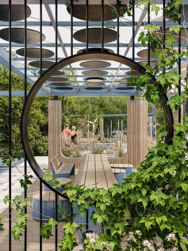 Беседка расположена рядом с первой детской зоной для малышей, чтобы родители могли спокойно отдыхать во дворе, не оставляя детей без присмотра. «Мы, как всегда, придерживаемся принципов добрососедства. В беседке можно устраивать детские праздники и мастер-классы, а в многофункциональной зоне — заниматься йогой вместе», — говорит Яременко.