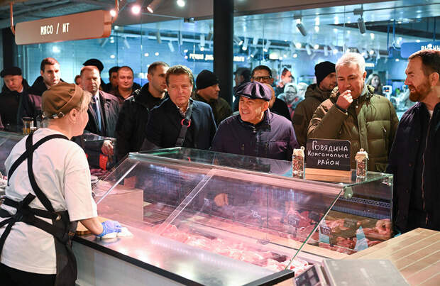 Экскурсия продолжилась в крытом здании рынка, где Раиса РТ угостили лепешкой из тандыра. Здесь он поговорил с продавцами мясного отдела с продукцией халяль