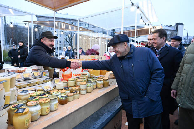 Сначала они ознакомились с территорией вокруг объекта – Минниханов попробовал здесь мед из Дрожжановского района республики, поинтересовался, откуда приехали дубовые и березовые веники (из соседней Марий Эл), похвалил местные яблоки и поговорил с покупателями.