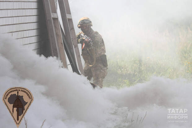 Бойцы отрабатывают штурм здания, а также разыгрывают бой за населенный пункт. Наблюдая за действием с крыши и в командном пункте, мы не увидели атаки широким фронтом, как, например, в известном фильме «Чапаев». Города берут совсем не так. Атакующие скрываются где-то в дымовой завесе, которая пахнет хлоркой, и двигаются перебежками. Мало что видно, лишь изредка силуэты в касках мелькают за углами зданий. В условиях городского боя передвигаться между домами нужно молниеносно.