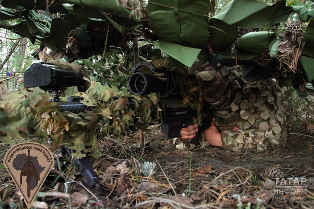 На холме среди сосен расположились снайперы. Стрелки работают парами, сменяя друг друга. Разглядеть их даже вблизи почти невозможно. Снайперы укрыты сеткой и сами одеты в маскхалаты. Их оружие тоже обмотано маскировкой. К слову, дальнобойная винтовка весит около 8 килограммов.