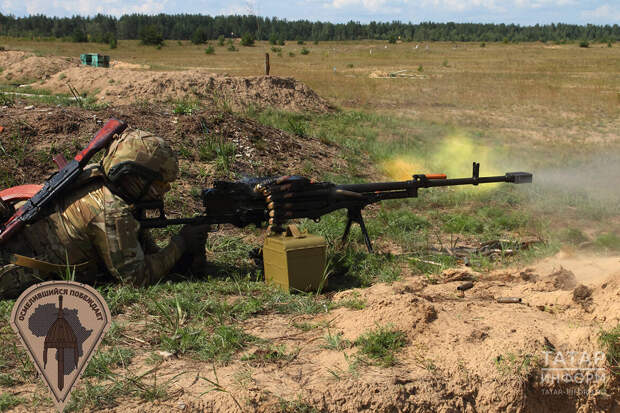 На полигоне проходит и строевая подготовка. Бойцы выполняют повороты с автоматами и пулеметами, падают на землю и перезаряжают оружие.