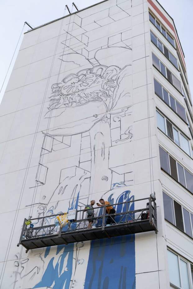 Автор муралов – московский художник Артем Стефанов (STFNV), известный 3D-иллюзиями, глитч-эффектами и экспериментами с восприятием. Он работает в жанре монументального искусства с 2007 года и уже начал разметку на первом фасаде. В новом проекте он использует технику оптического мурала – росписи, создающей эффект объема и глубины с определенной точки обзора.