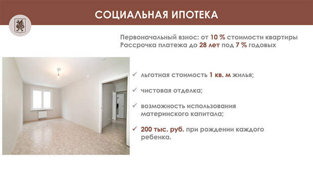 Напомним, что социальная ипотека выдается Госжилфондом при Раисе РТ сроком до 28,5 года под 7% годовых, размер первоначального взноса составляет от 10% от стоимости квартиры. При рождении (усыновлении) ребенка после постановки на учет полагается безвозмездная субсидия в размере 200 тыс. рублей на каждого ребенка.