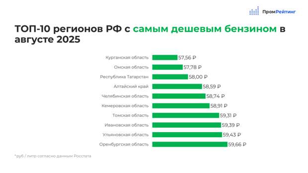 Татарстан занял третье место в рейтинге регионов России с самым дешевым бензином. По итогам августа 2025 года средняя потребительская стоимость топлива в республике составила 58 рублей за литр, следует из аналитики агентства «ПромРейтинг».