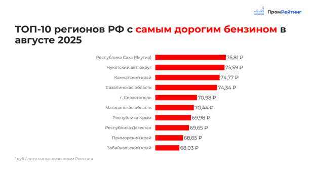 В «десятку» регионов с самым дорогим топливом вошли Республика Саха (75,81), Чукотский автономный округ (75,59), Камчатский край (74,77), Сахалинская область (74,34), Севастополь (70,98), Магаданская область (70,44), Республика Крым (69,98), Республика Дагестан (69,65), Приморский (68,65) и Забайкальский (68,03) края.
