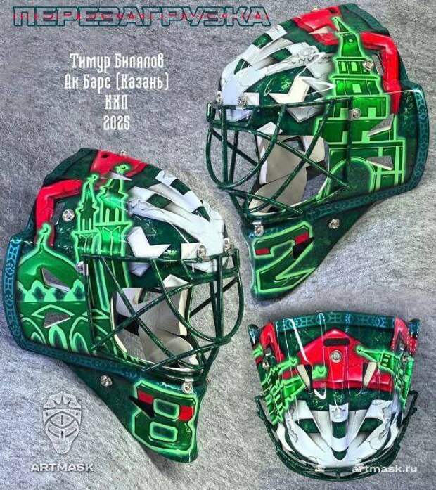 Вратарь «Ак Барса» Тимур Билялов представил новый шлем на сезон 2025/2026. Теперь на амуниции голкипера изображены главные достопримечательности Казани в неоновой подсветке. С правой стороны шлема изображена мечеть Кул Шариф, а слева – башня Сююмбике.