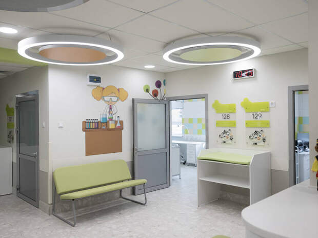 На третьем этаже размещены семь кабинетов педиатрии, прививочный кабинет, кабинеты эпидемиолога и аллерголога. Тут же расположена лаборатория, где будут изучать клинические анализы. Помимо прочего, на каждом этаже имеются комнаты матери и ребенка, укомплектованные всем необходимым.