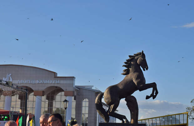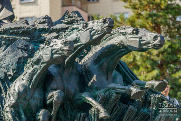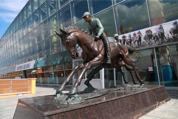 И, наконец, скульптуры лошадей в Казани можно найти на месте бывшего парадного входа старого ипподрома и на территории нового. Первая – мчащийся всадник с соколом на руке, обрамленный полумесяцем. Эта декоративная композиция «Тулпар» появилась в городе в 1997 году, но и с переносом ипподрома на новое место продолжает оставаться на постаменте. Автор – Игорь Башмаков.