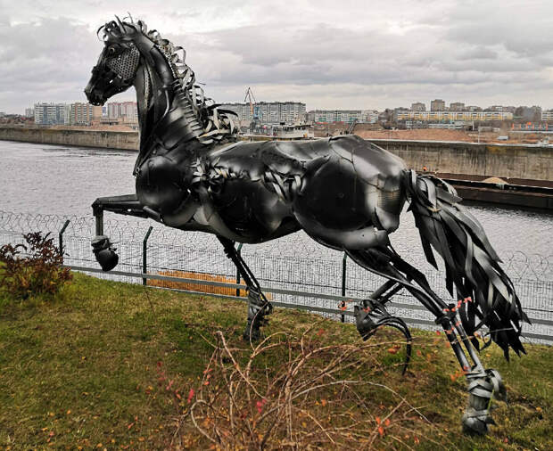 Автор этого творения – старший мастер турбинного цеха ГЭС Ринат Юсупов. Челнинец создавал мчащегося железного коня, символизирующего мощь и энергетику, несколько лет, впечатлившись скульптурой известного американского художника Джона Лопеса (он создает свои работы из металлолома и в стиле стимпанк).